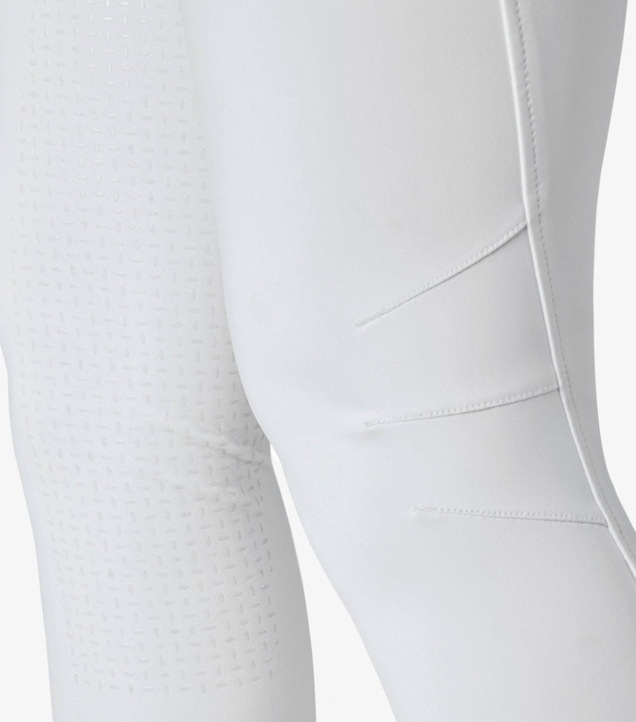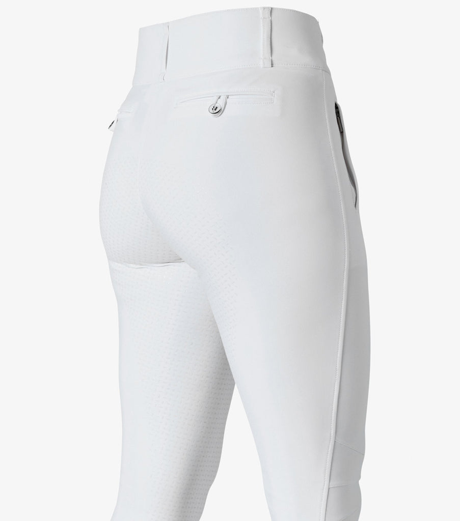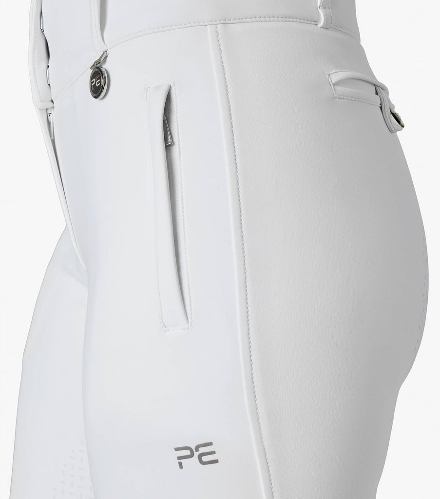 A full seat of mid weight gel provides moderate grip against the saddle and ergonomically placed pleats at the knee allow for a contoured, comfortable fit and unrestricted movement. Two front zip pockets offer a place to store valuables and two rear button fastened pockets enhance shape. A slider fastening secures the breeches and the waist features belt loops along with our signature PE brooch.
