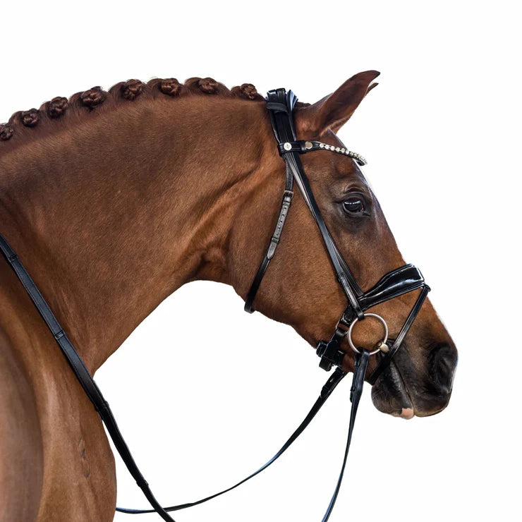 Take flight with our newest LT Anti-Gravity Bridle. The Anti-Gravity Glam Snaffle Bridle is constructed using flat leather and features our standout Glam style patent leather noseband.