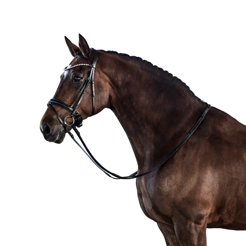 The crown piece is anatomically designed and slimmed behind the ears to increase the height at which the brow band can be positioned to ensure adequate clearance of the orbital bone. The noseband is slim as it traverses the body of the mandible and features rounded dee rings. The streamlined noseband ensures the cheek pieces maintain close contact with the horse as they connect to the bit.