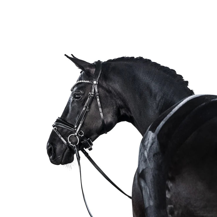 The crown piece is anatomically designed and slimmed behind the ears to increase the height at which the brow band can be positioned to ensure adequate clearance of the orbital bone. The noseband is slim as it traverses the body of the mandible and features rounded dee rings. The streamlined noseband ensures the cheek pieces maintain close contact with the horse as they connect to the bit.