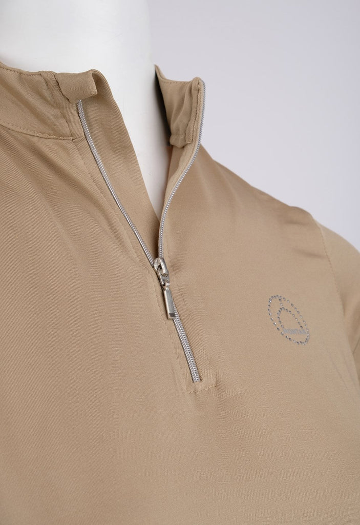 Everly Logo Polo with short sleeves and a low stand-up collar. In the front is a silver neck zipper and on the left side of the chest is a Montar logo in clear crystals. The highly functional Mon-tech fabric is breathable and sweat-absorbent, which ensures a comfortable feeling even when you work hard riding your horse. The perfect polo for training. Available in new spring colors.