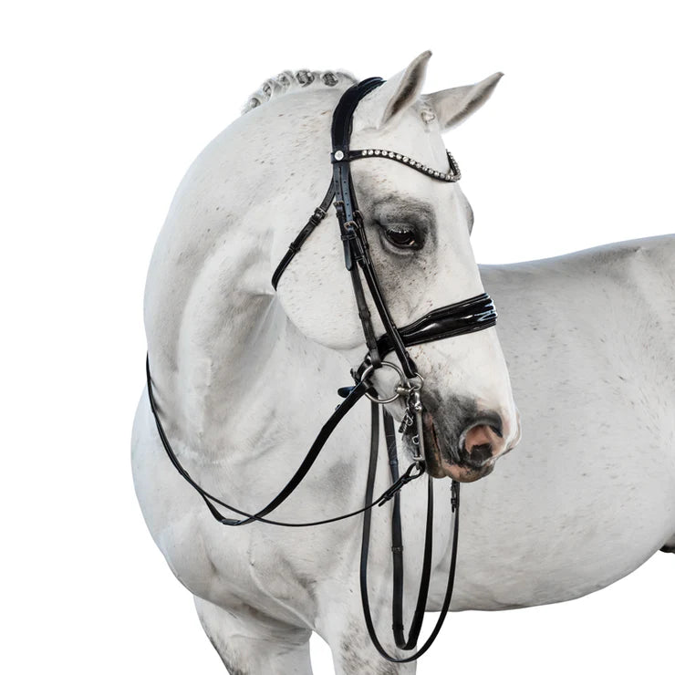Constructed from flat Italian leather our nosebands meet the highest standards for aesthetics and quality. The noseband is slim as it traverses the body of the mandible and features rounded dee rings. The streamlined noseband ensures the cheek pieces maintain close contact with the horse as they connect to the bit.