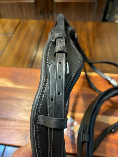 This beautiful Bridle2Fit Bridle is crafted from super soft leather that is well padded at the crown and noseband. The crown offers an anatomical design cut well away from the ears and is broader in the middle to disperse pressure away from the poll area. The noseband has soft rich padding and a single strap(not a crank)and flash. The bit cheek pieces attached at the top of the crown piece.The browband is raised and padded.