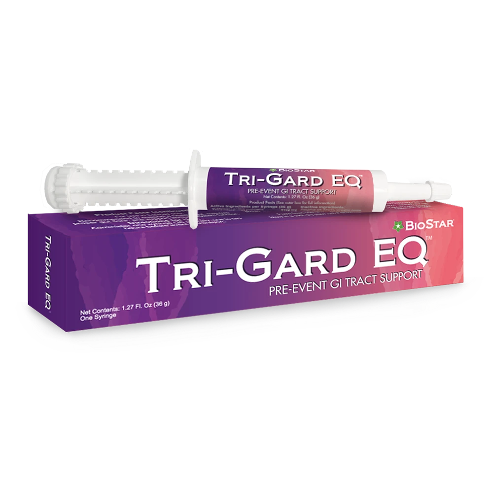 Tri-Gard EQ is a pre-event paste in a syringe that supports a healthy gastric and digestive system to use when shipping and competing.